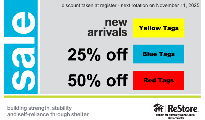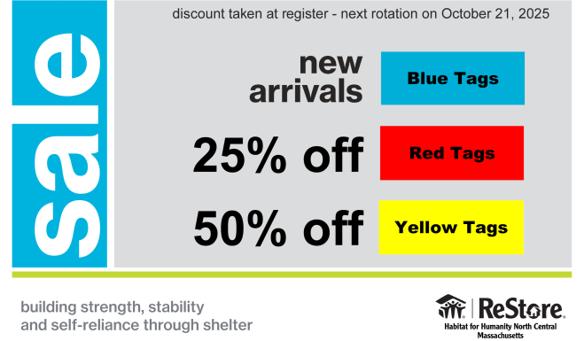 Our ReStore sells donated new and gently used furniture, home improvement and building materials at a fraction of the original retail value. All profits go to support home ownership for hard working families in North Central Massachusetts, while keeping good, reusable materials in use and out of the landfill.