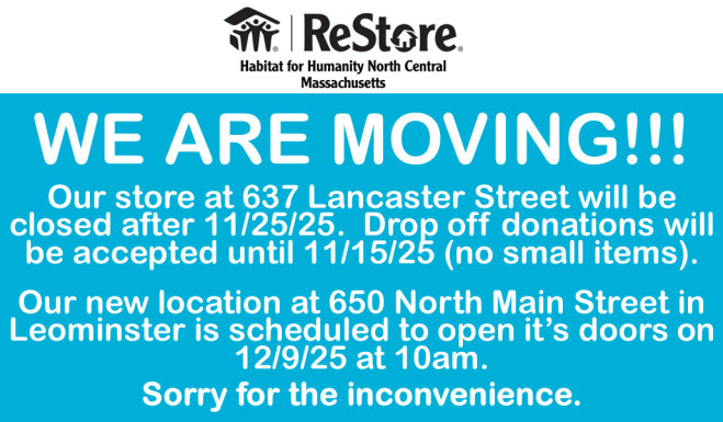 Our store at 637 Lancaster Street will be closed after 11/25/25. Drop off donations with the exception of small items will be accepted until 11/15/25. Our new location at 650 North Main Street in Leominster is scheduled to open it’s doors on 12/9/25 at 10am. Sorry for the inconvenience.